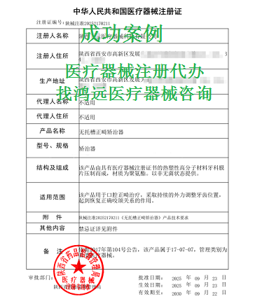 鸿远医疗器械咨询提供专业的医疗器械注册技术咨询服务,无托槽矫治器产品注册证办理成功案例如图:
