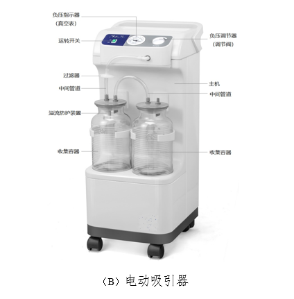 医用电动吸引器主要由负压源、负压指示器、空气过滤器、收集容器组件(收集容器和带吸引接头的密封盖)、防溢流装置(浮子阀或缓冲杯等)、负压调节装置、中间管道、吸引管道构成。