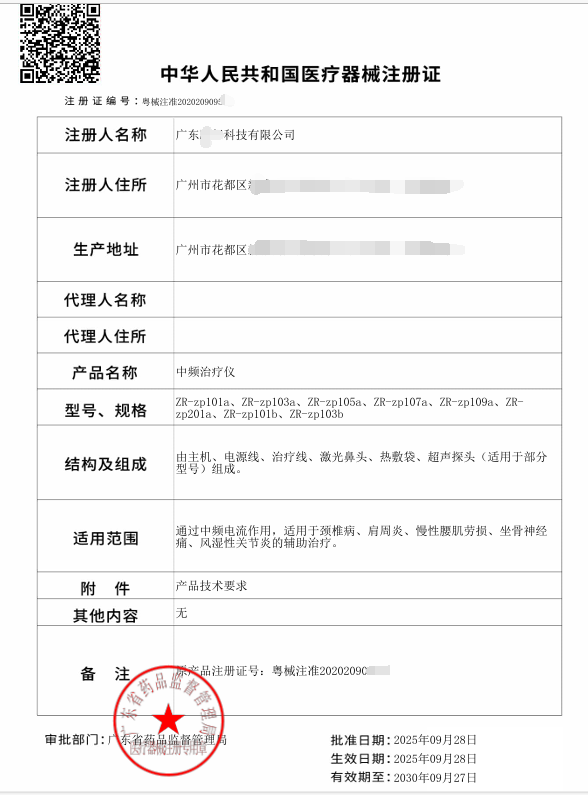 恭喜!广州腾想取得中频冶疗仪产品的注册证
